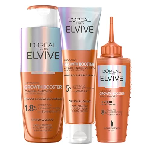 La Rutina Anticaída L’Oréal Paris Elvive Growth Booster es un tratamiento intensivo de 6 semanas diseñado para cabellos propensos a la caída y la rotura. Esta rutina completa (Champú Anticaída, Acondicionador y Sérum Anticaída) está impulsada por el complejo patentado [Aminexil-R], clínicamente probado para anclar el cabello a la raíz y estimular la fase de crecimiento.