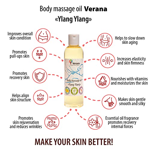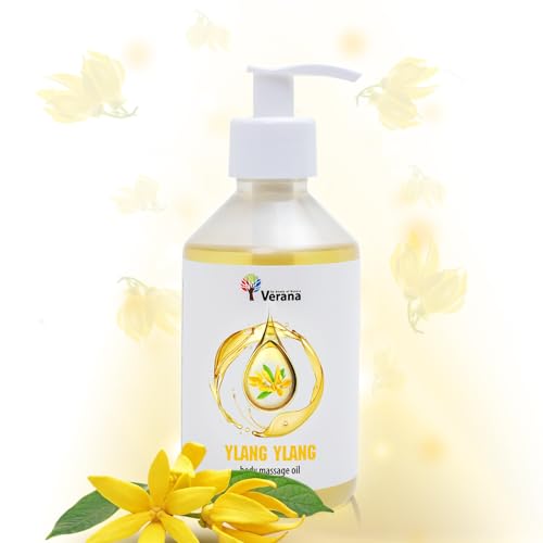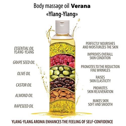 Verana Aceite de masaje corporal Ylang-Ylang, cosmética natural para todos los tipos de piel, efecto revitalizante e hidratante, mejora la sensación de confianza, aromaterapia (250ml)