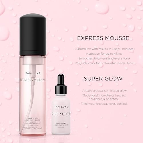 Tan-Luxe Express Mousse Autobronceador 200 ml + Tan Luxe SUPER GLOW Serum Autobronceador, (30 ml) Cuidado de la piel autobronceador diario rajadura a rajadura, rajado de crueldad bestial y vegano
