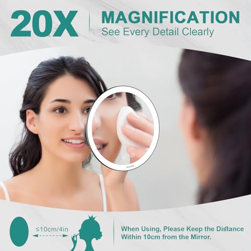 💎【MAGNIFICACIÓN 20X】El espejo de aumento 20X puede mostrar los detalles de la cara con extrema precisión. Es ideal para el afeitado, el uso de lentes de contacto y el maquillaje. Sin embargo, Tiene que acercar su rostro MUY CERCA (aprox. 10 cm) al espejo para ver con claridad. Si está demasiado lejos, verá su cara distorsionada o incluso saldrá boca abajo y puede provocar mareos.